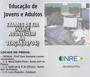 08:10 Exames de EJA Online acontecem dia 30/04 Os exames são realizados em duas etapas diferentes, abordando as oito disciplinas do Ensino Fundamental Fase II (6o ao 9o ano).
