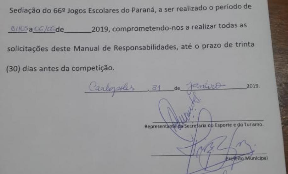 A chefe do Núcleo Regional de Educação de Jacarezinho professora Ana Maria Molini reuniu-se com o prefeito do município de Carlópolis Hiroshi Kubo onde foi assinado o Termo de Compromisso para a realização dos Jogos Escolares do Paraná.