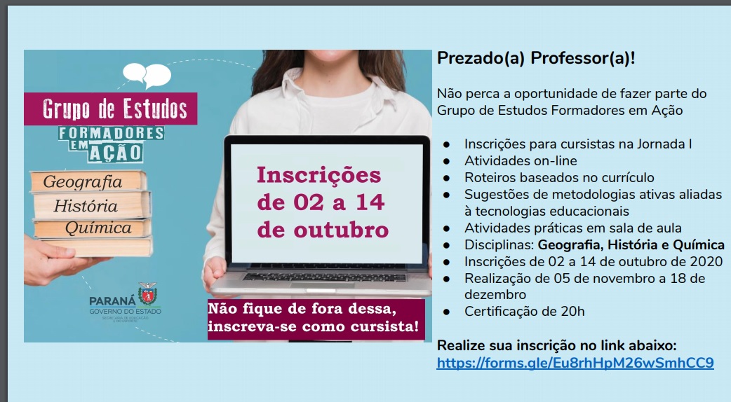 Estamos com inscrições abertas para o Grupo de Estudos Formadores em Ação, para cursistas e formadores das disciplinas de Geografia, História e Química.
