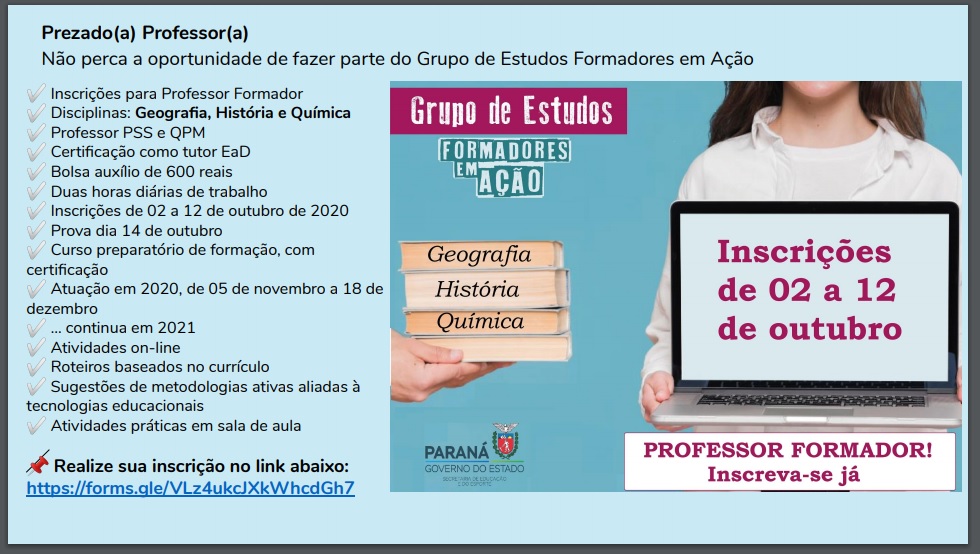 - Público alvo: professores QPM e PSS da rede estadual de ensino atuantes nas disciplinas de Geografia, História e Química.
