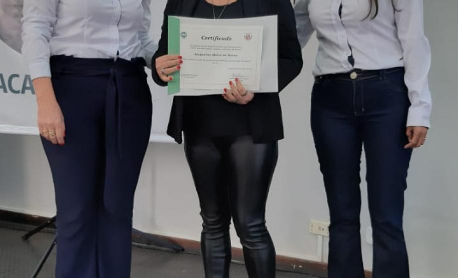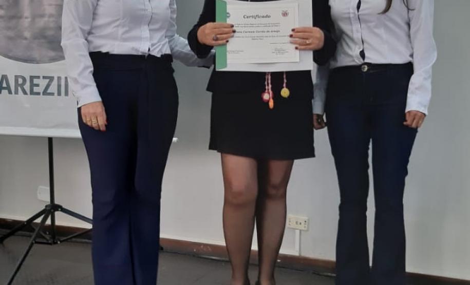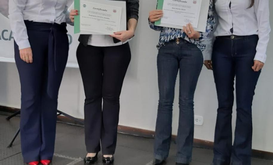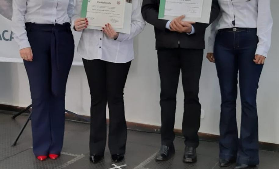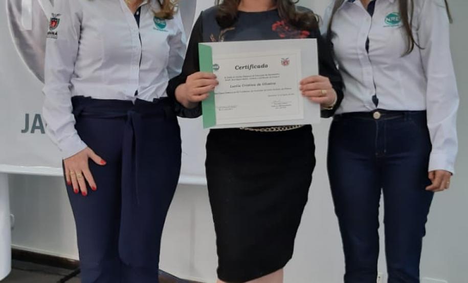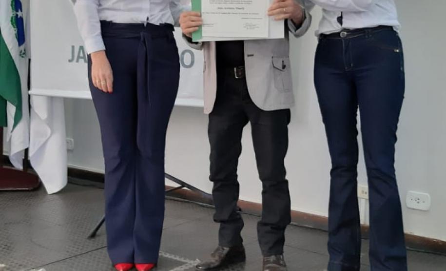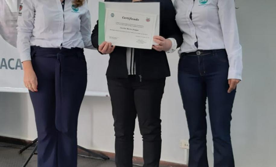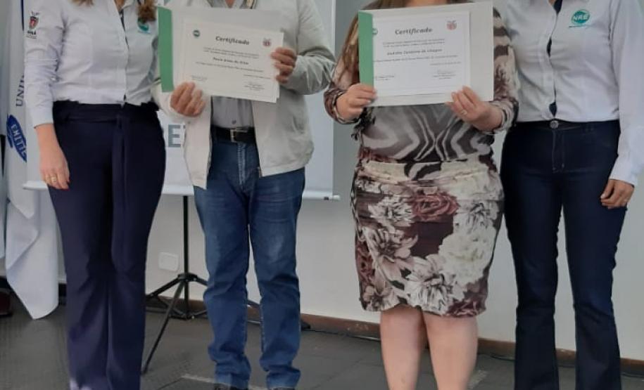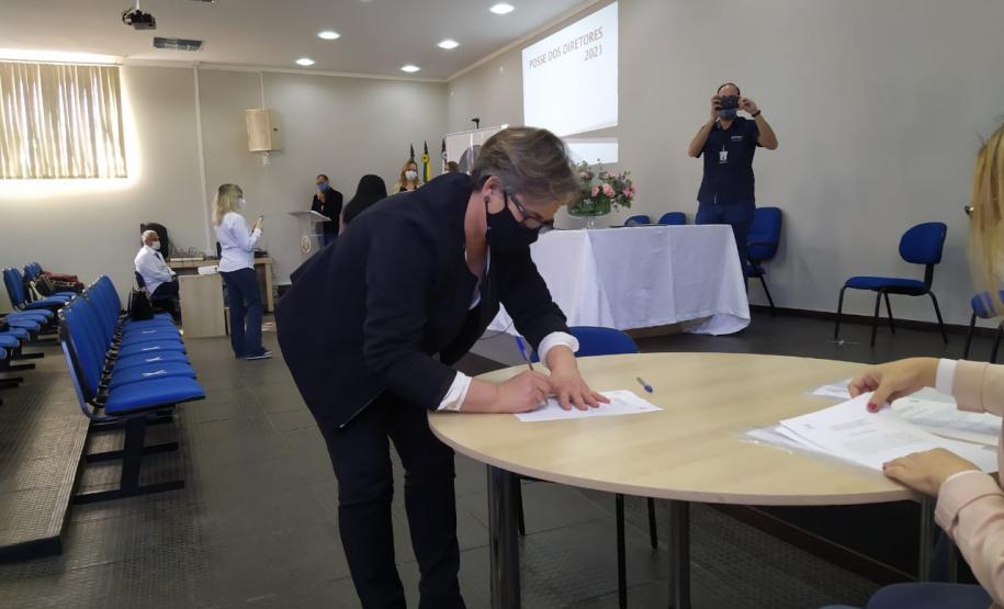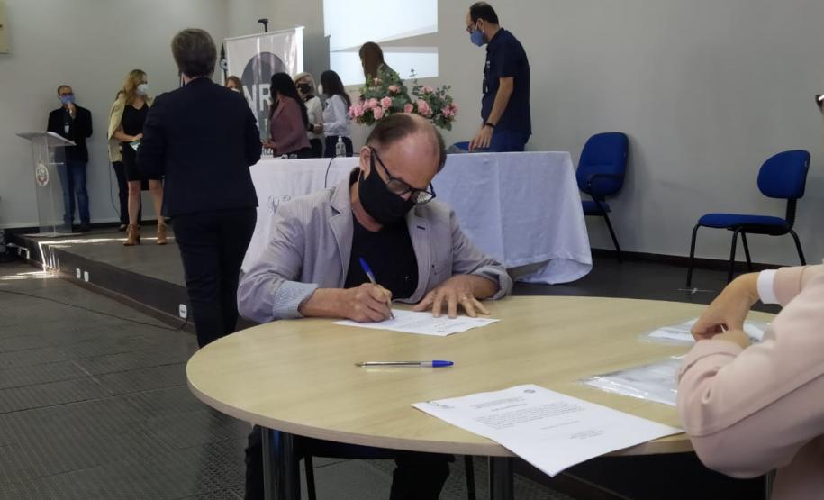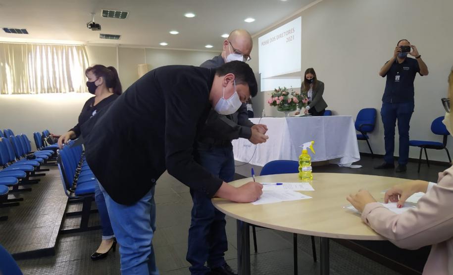 Os diretores e diretores auxiliares eleitos das instituições públicas estaduais assinaram a ata de posse e receberam um certificado de posse entregues pela chefia e assistente do Núcleo Regional de Educação.