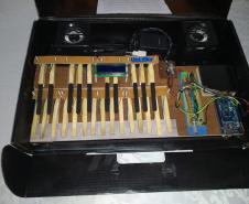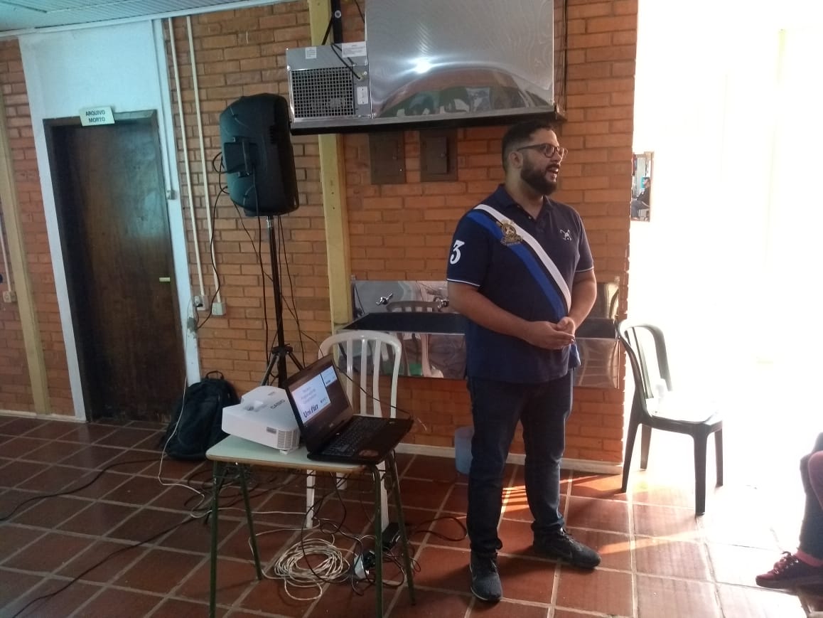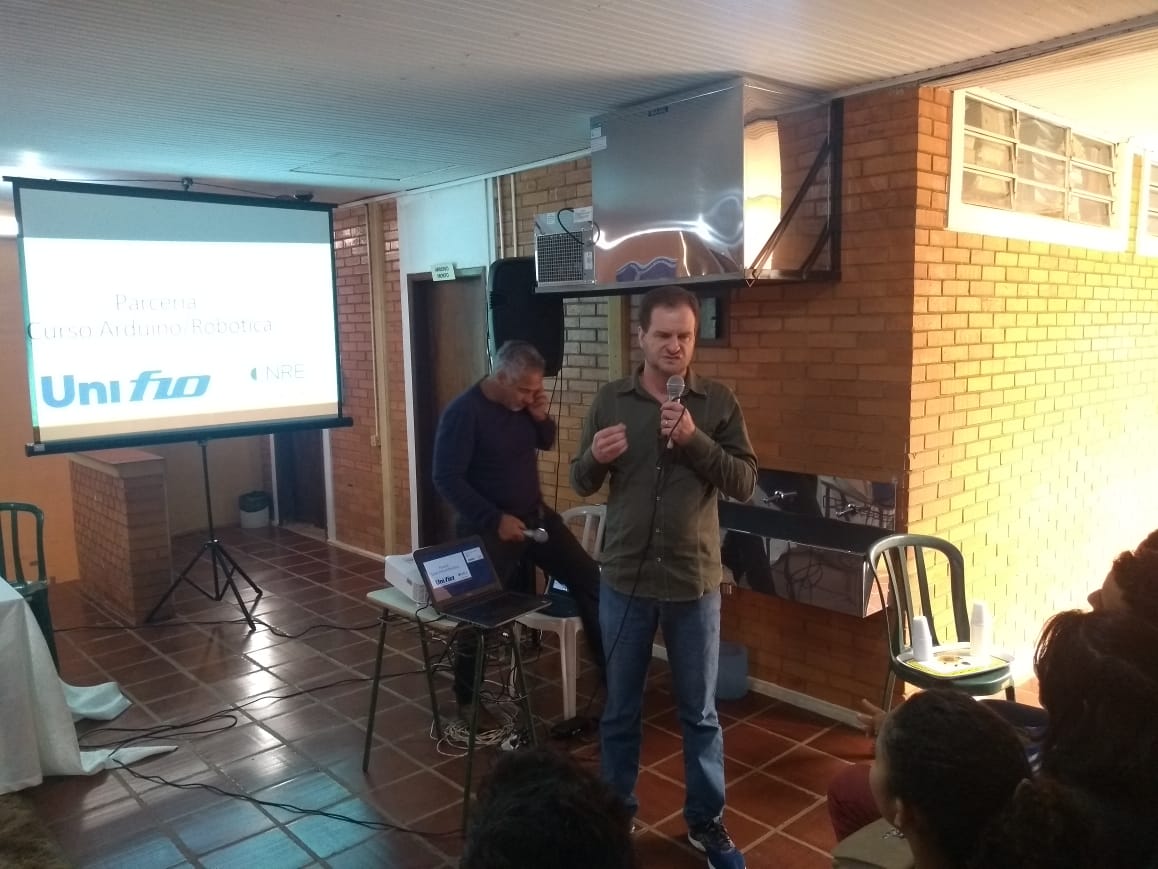 Os professores da Unifio André Giovanni Castaldin e Rodrigo Ayres falaram sobre a relevância dessa parceria e abordaram de forma sucinta sobre o conteúdo e objetivos dos cursos que irão ministrar. Além disso, trouxeram um equipamento musical feito com arduíno e materiais recicláveis para que os alunos pudessem interagir.